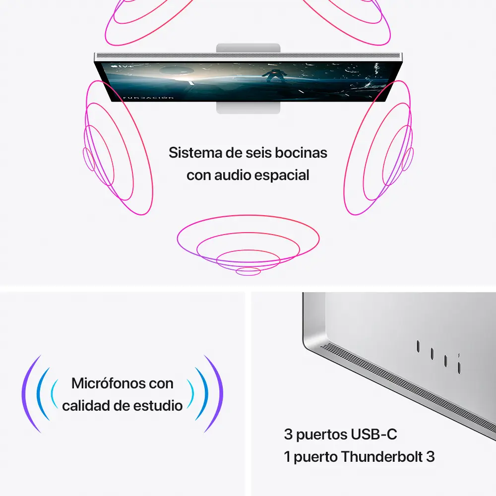 | Información de Marketing | Un mundo completamente nuevo se abre ante tus ojos desde el instante en que lo enciendes. Así es el monitor Studio Display. Tiene un diseño todo pantalla delgado y elegante, y viene con funcionalidades increíbles para que todo lo que hagas cobre vida con colores espectaculares y un nivel de detalle asombroso. |